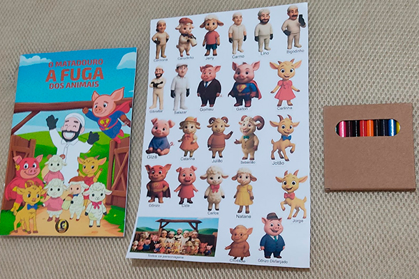 Acompanha um brinde: lápis para colorir e autocolantes com todos os personagens.